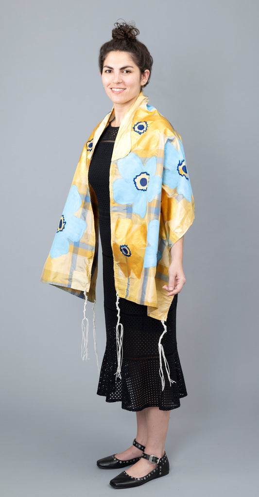 Blue and Gold Silk Plaid Tallit with Handpainted Marimekko Flowers