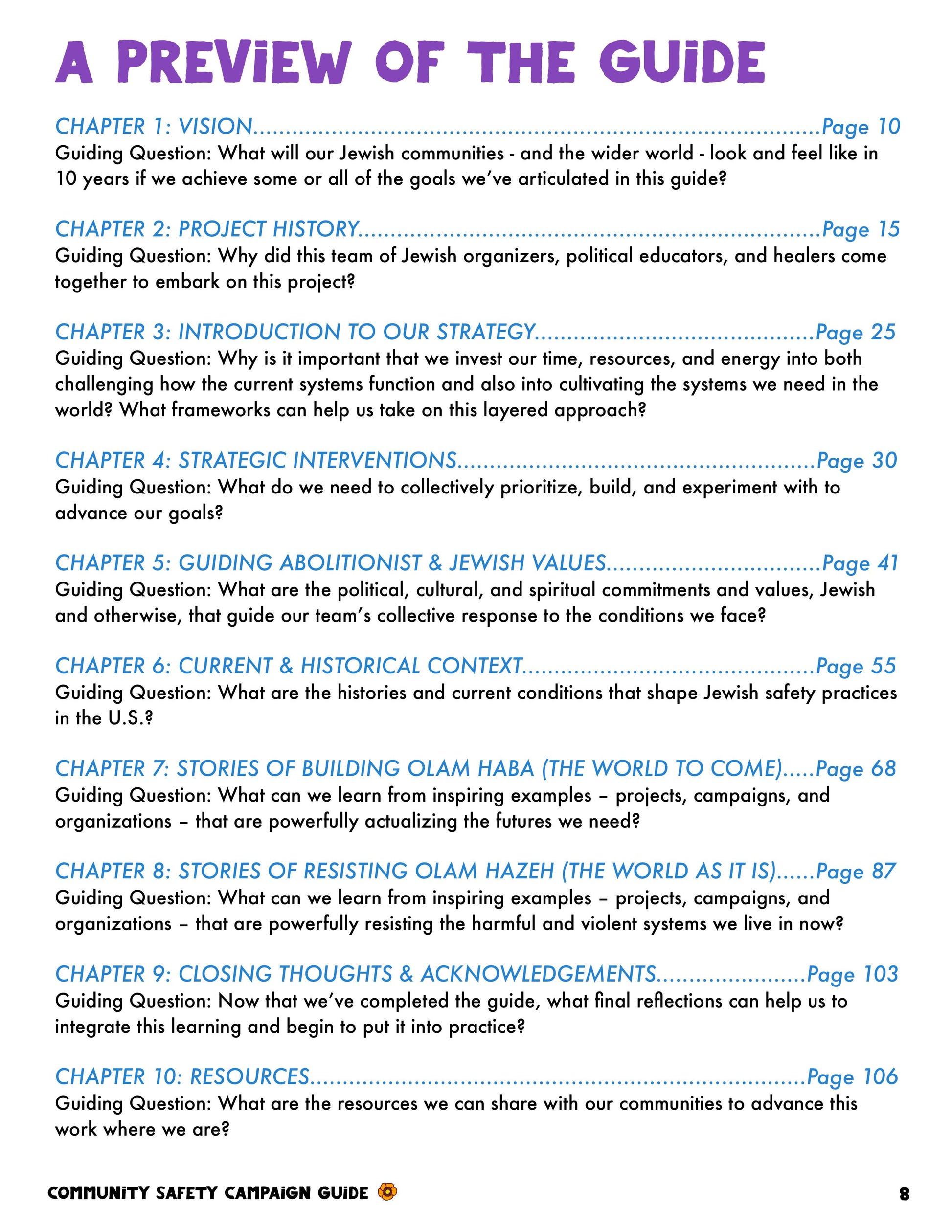 We wrote this guide as an organizing tool, not simply as a text to be consumed. Our aim is to increase safety both within and beyond Jewish communities. We encourage you to engage with it in community rather than on your own.
