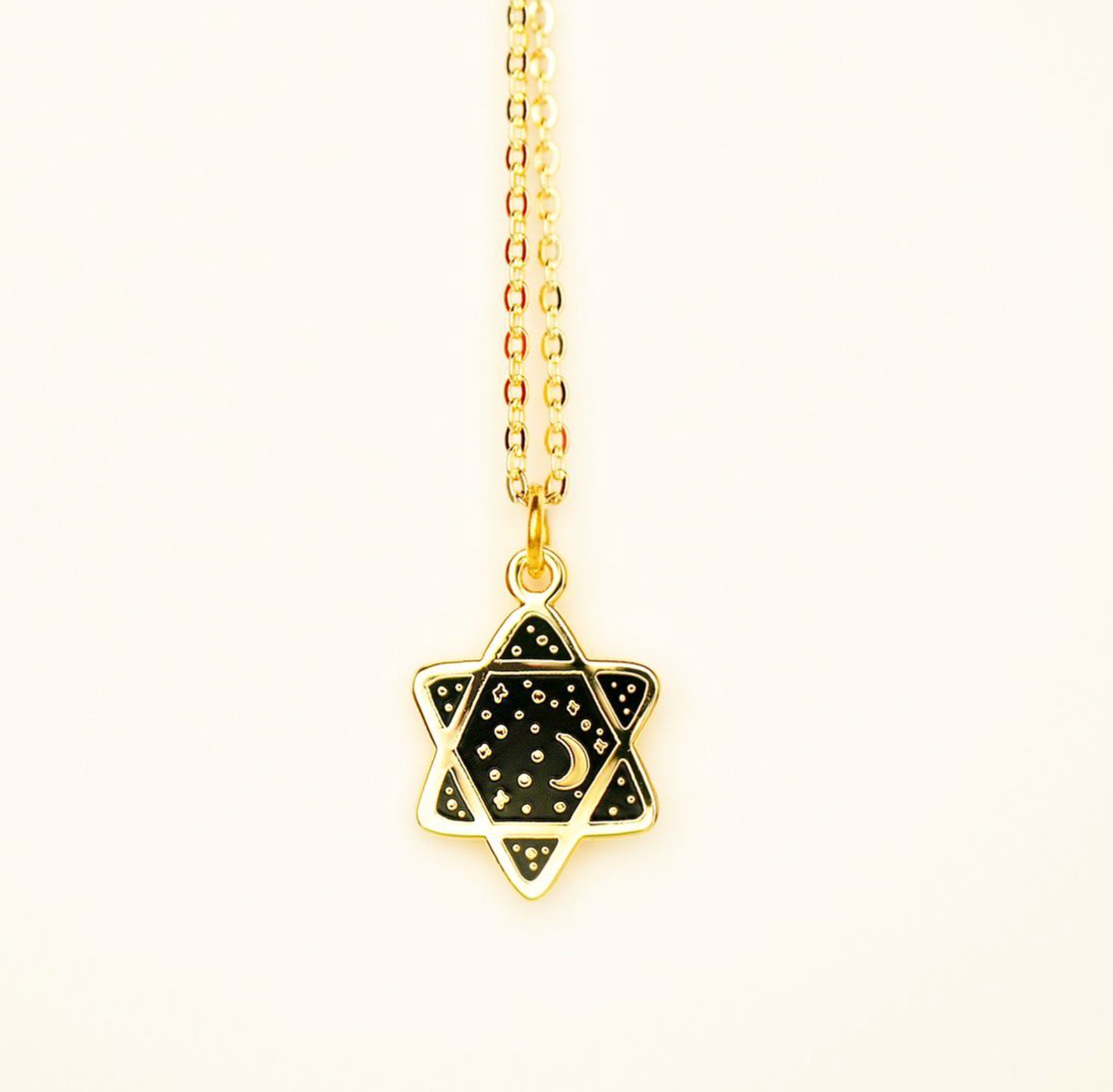 Discover the stunning design of this exquisite Cosmic Star of David Necklace. This captivating piece beautifully showcases the symbol of the Star of David, representing the rich heritage and spirituality of Judaism. Crafted with utmost care and attention to detail, this necklace is a true gem that will add a touch of elegance to any outfit.