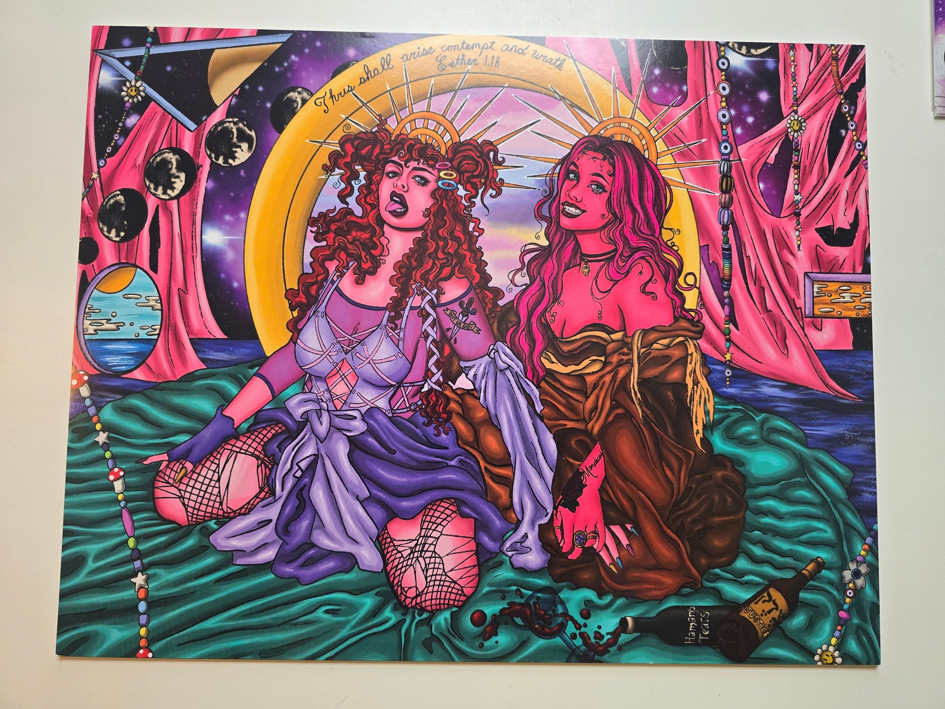 Artist statement: I'm playing with spacey/ intergalactic Esther and Vashti traveling through the universe bottling one jerks tears at a time. Vashti will never stop being one of the most iconic women in the Torah to me. The panic her braveness caused is something to celebrate and cultivate in our modern day! No, women aren’t objects for you to parade around your friends. No, we won’t bend to your will. We’re too busy creating magic with our soul sisters🧚🏼♀️🧚🏽♂️. Esther inspires me daily to believe that I was created for a divine purpose and that life is worth living, no matter how hard it gets. She’s the epitome of strength and I’m so happy we honor her every single year.