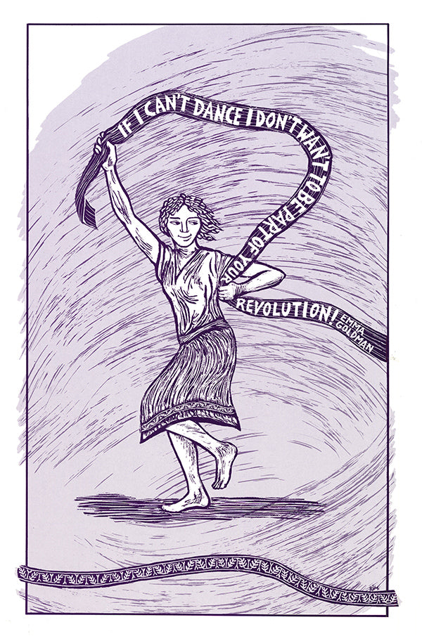 A poster with a dancing resistance fighter and quote attributed to early Jewish feminist and anarchist Emma Goldman. “If I can’t dance, I don’t want to be a part of your revolution.”