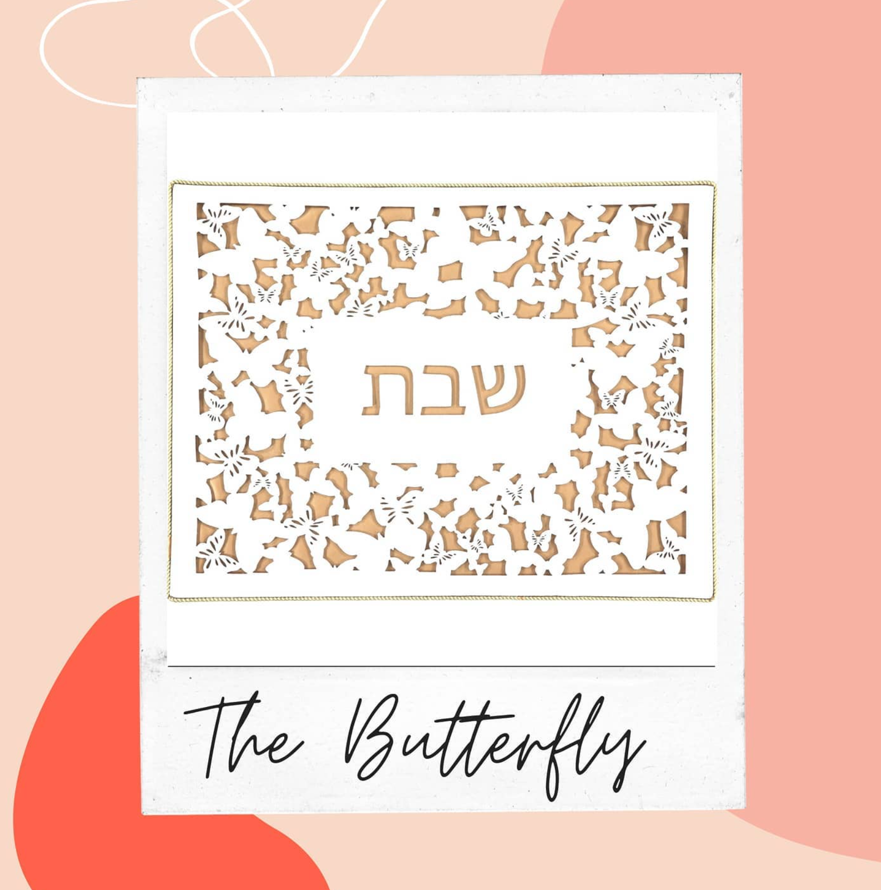 Lazercut to precision with the word Shabbat and butterflies as the background, Sefardi artist Fortune Chelme puts a modern cultural twist on the traditional challah cover. Inspired by Sefardic ritual objects like tfillin ags made from leather, she created Judaica exclusively from leather.