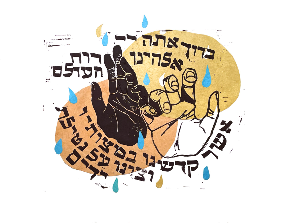 Block print of two hands reaching up, with the handwashing blessing written in hebrew text: “baruch atah hashem eloheynu ruach haolam asher kidshanu b’mitzvotav v’tzivanu al netilat yadayim,” against yellow and orange collaged background and blue water droplets.