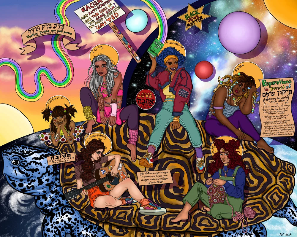 "In creating this work, I wanted to dream about the euphoria that could be experienced through unity amongst the global community of marginalized people. It is my belief that the terrors that Jewish people face come from the same source as the terrors that Black brown and indigenous people face... As much as the fight for reparations will take all of our collective solidarity, it will also require our collective spiritual conviction. I think that when our struggle transforms into a divine fight, guided by our promise to pursue justice, our success is only a matter of time." - Artist statement, Ayeola O. Kaplan