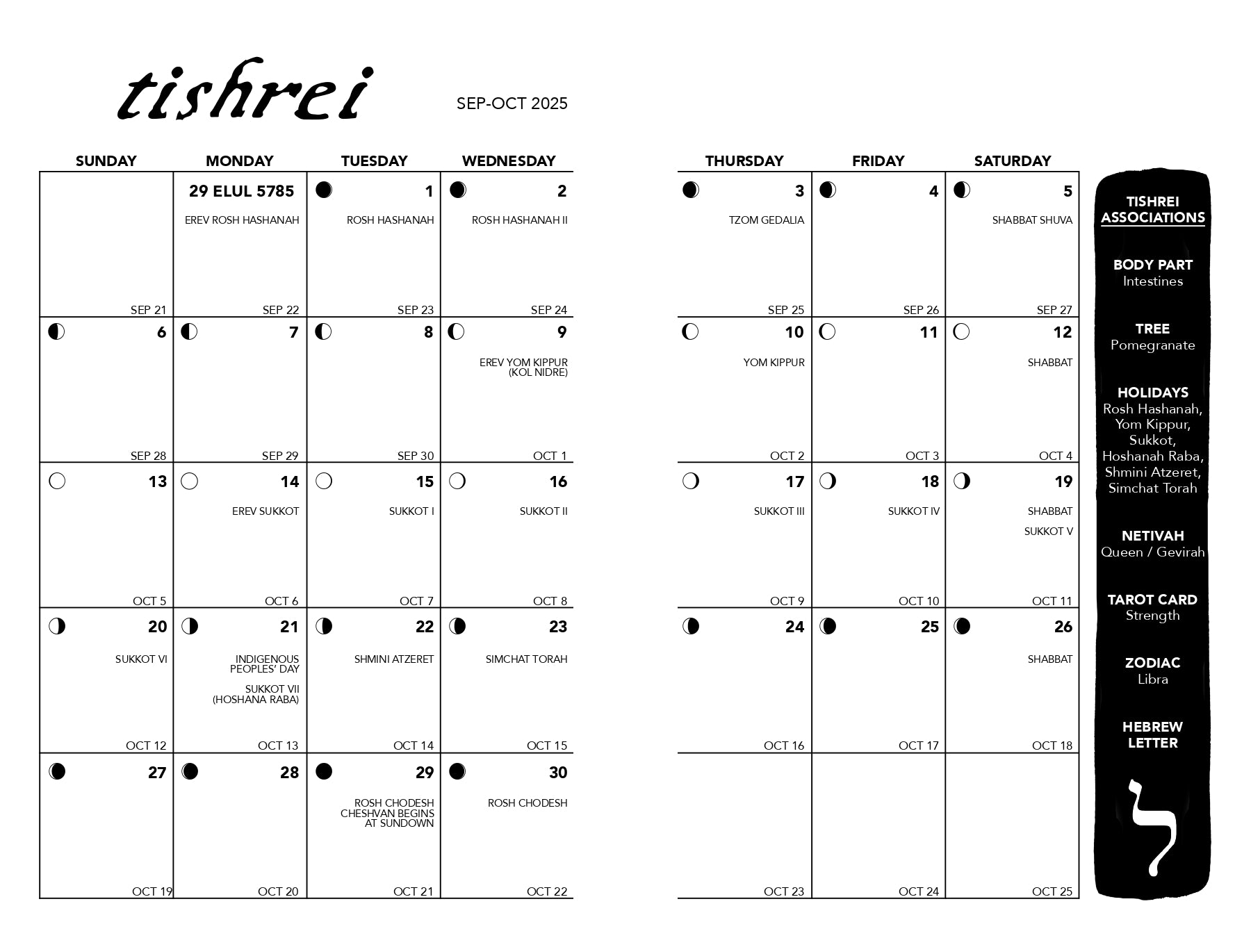 This daily planner anchors us in ancient rhythms and lineages of resistance, weaving collaborations with the earth, the heavens, and the possibilities inherent in every moment. This combined Hebrew / Gregorian / moon calendar, dream journal, and daily planner includes art and teachings related to the Hebrew months, Jewish holidays, Torah portions, mystical associations, a detailed Omer count, and more room than ever for writing your own plans and dreams. We draw upon the support and sustenance of ancestral Jewish, Black, Arab, Asian, anti-Zionist, queer, disabled, feminist and earth-based wisdom, as we lean toward each other and our dreams of a liberated future.