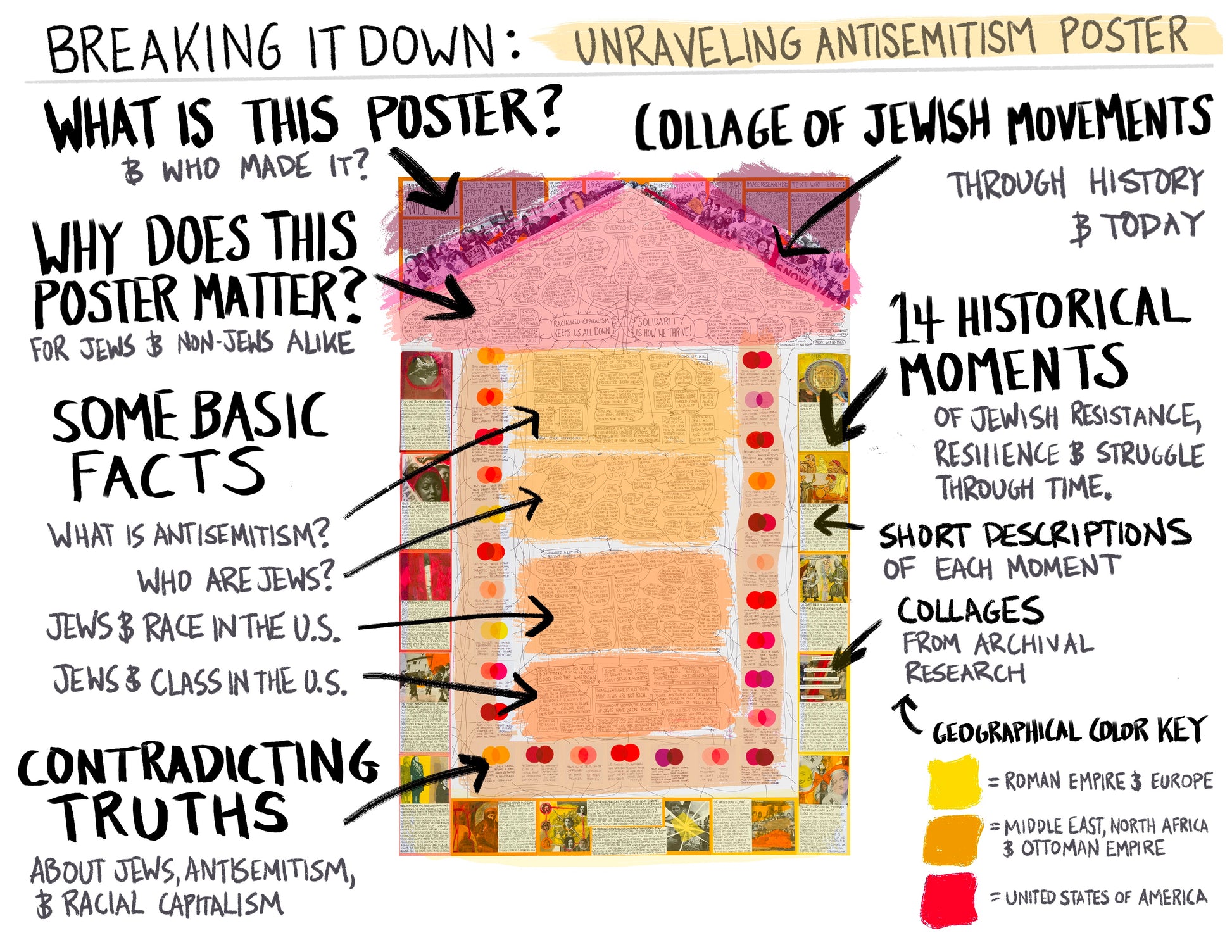 This poster is a web of information about antisemitism, designed for Jews and non-Jews alike to get clear about who Jews are, and how Jews have been used for centuries to prevent multiracial working class movements from building power. Making connections between the facts, contradictions, and histories from 4th C. CE to today, the poster was researched, written and drawn by the membership of Jews For Racial & Economic Justice (JFREJ), a grassroots membership organization in NYC, between 2018-2021, through a process lead by artists Rebecca Katz and Rachel Schragis.